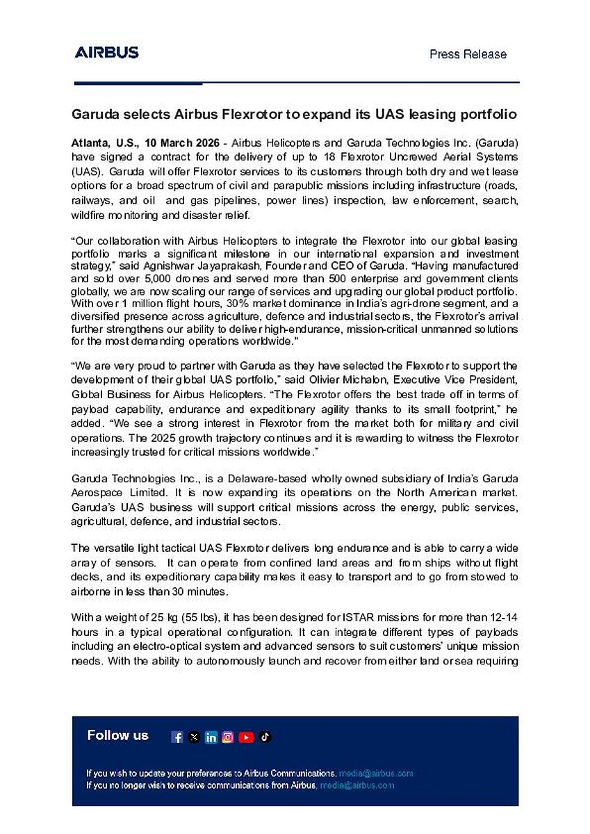 Atlanta, U.S., 10 March 2026 - Airbus Helicopters and Garuda Technologies Inc. (Garuda) have signed a contract for the delivery of up to 18 Flexrotor Uncrewed Aerial Systems (UAS). Garuda will offer Flexrotor services to its customers through both dry and wet lease options for a broad spectrum of civil and parapublic missions including infrastructure (roads, railways, and oil and gas pipelines, power lines) inspection, law enforcement, search, wildfire monitoring and disaster relief.