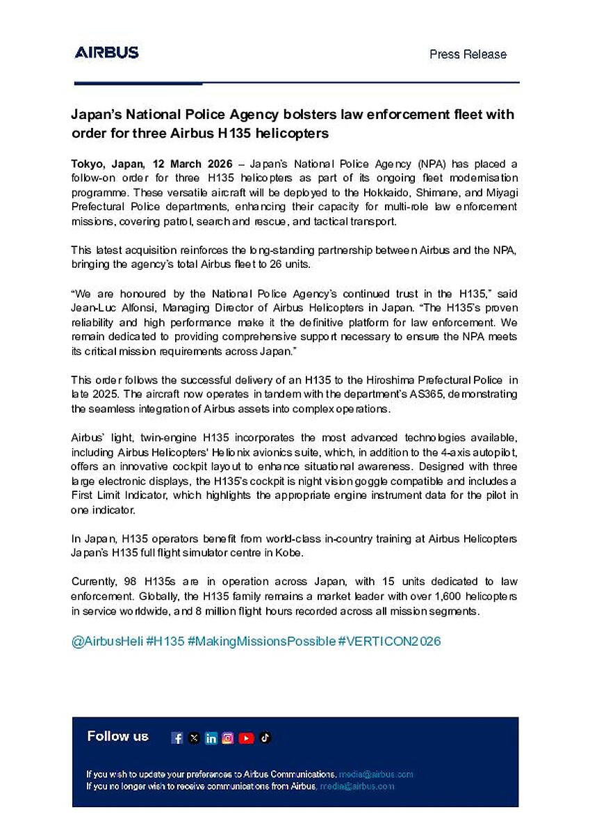 “We are honoured by the National Police Agency’s continued trust in the H135,” said Jean-Luc Alfonsi, Managing Director of Airbus Helicopters in Japan. “The H135’s proven reliability and high performance make it the definitive platform for law enforcement. We remain dedicated to providing comprehensive support necessary to ensure the NPA meets its critical mission requirements across Japan.”