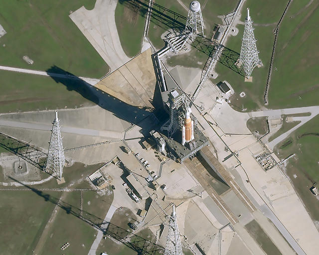 The Artemis II launch is getting closer: Captured from orbit by our Pléiades Neo satellite, this high-resolution image shows the Space Launch System (SLS) rocket, carrying Orion and the Airbus-built European Service Module (ESM), at the launch pad at Kennedy Space Center. This view marks a significant step in the preparations for the Artemis II mission.